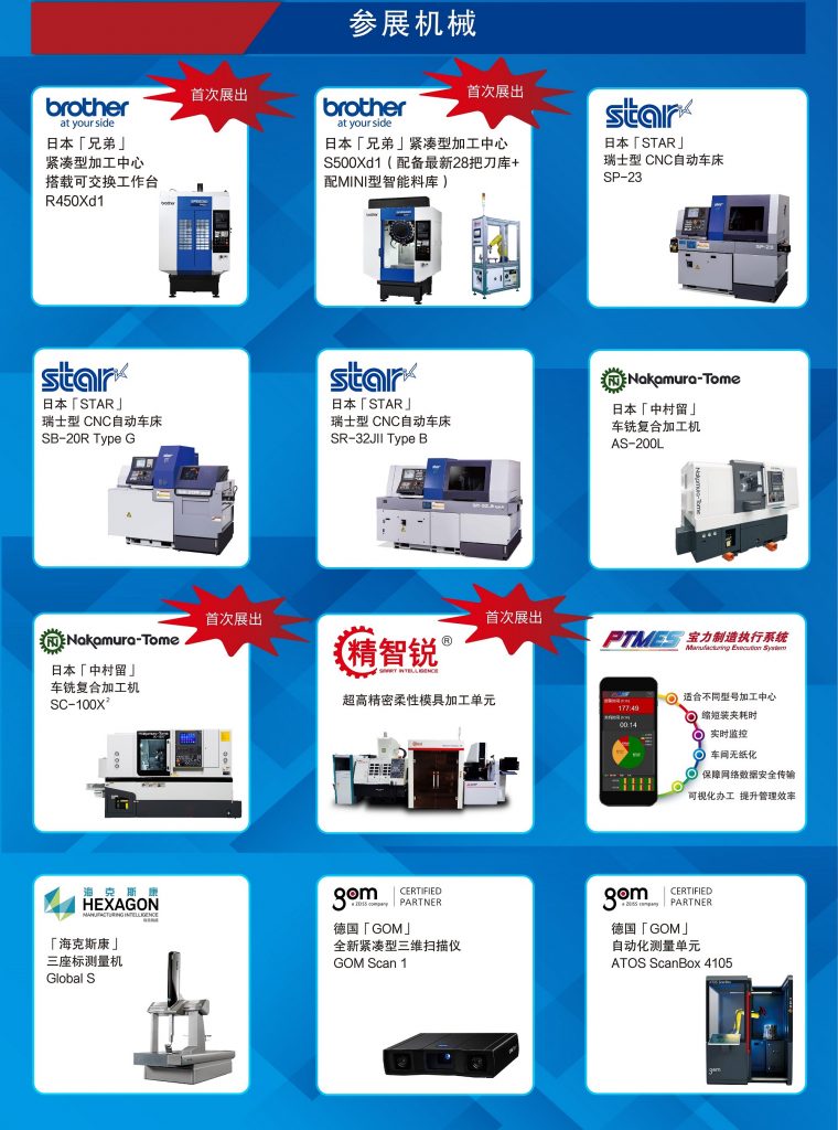 此次展会,我司将展出日本「兄弟」紧凑型加工中心、日本「STAR」瑞士型CNC自动车床、日本「中村留」车铣复合加工机、「海克斯康」三座标测量机、德国「GOM」三维光学扫描仪及自动化测量单元。由我司自主研发品牌「精智锐」首次展出超高精密柔性电极加工单元,以及展出宝力制造执行系统。 我司展位位于7号馆,展位号7-C01,届时恭候您的莅临。 |