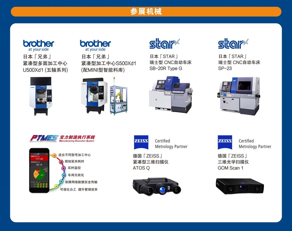 | 此次展会,我司将展出日本「兄弟」紧凑型加工中心、日本[STAR]瑞士型CNC自动车床、德国[ZEISS]三维光学扫描仪以及宝力制造执行PTMES系统。 |